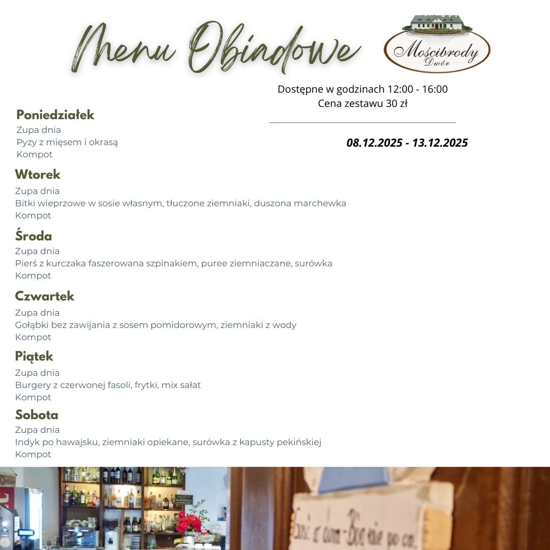 Strona główna Aktualne wydarzenia Menu tygodniowe Aktualne wydarzenia 2025-07-20 Menu tygodniowe Menu tygodniowe 8 - 13grudnia 2025Zapraszamy na domowe obiady serwowane od poniedziałku do soboty. Smacznie, sezonowo i w klimacie dworskiej gościnności. Menu w grafice poniżej Dwór Mościbrody Rezerwacje i kontakt: 25 641 70 30 Do zobaczenia przy stole!