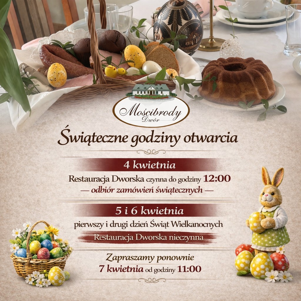 Dlatego zostawiamy dla Was krótką informację o godzinach otwarcia Restauracji Dworskiej w czasie Wielkanocy:
