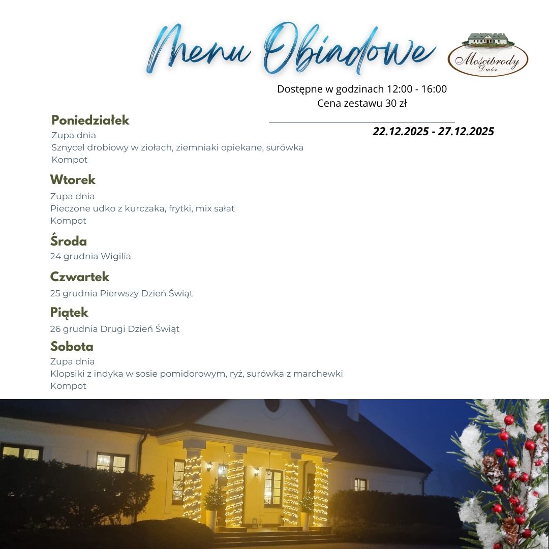 Strona główna Aktualne wydarzenia Menu tygodniowe Aktualne wydarzenia 2025-07-20 Menu tygodniowe Menu tygodniowe 22 - 27 grudnia 2025Zapraszamy na domowe obiady serwowane od poniedziałku do soboty. Smacznie, sezonowo i w klimacie dworskiej gościnności. Menu w grafice poniżej Dwór Mościbrody Rezerwacje i kontakt: 25 641 70 30 Do zobaczenia przy stole!
