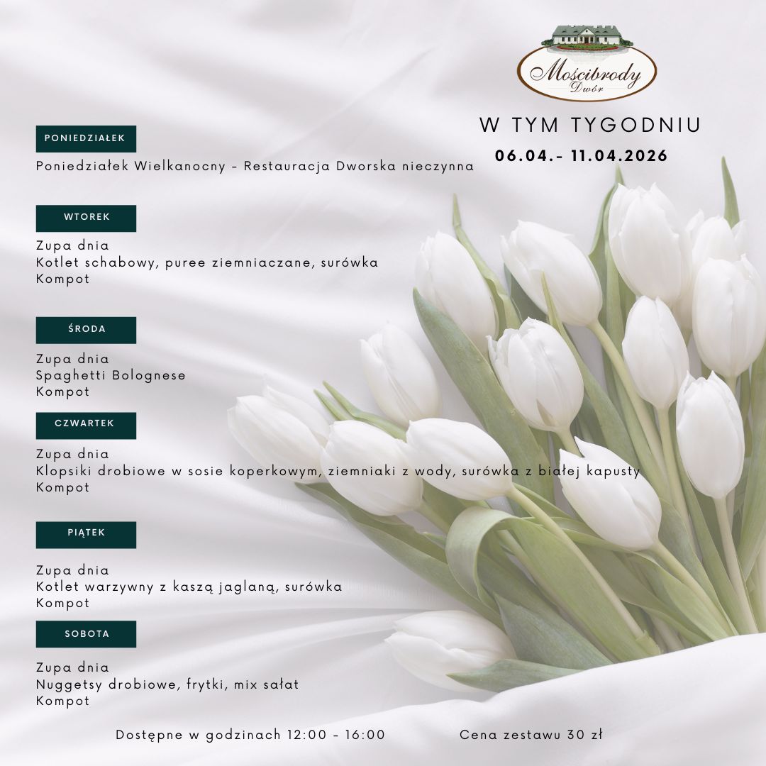 Strona główna Aktualne wydarzenia Menu tygodniowe Aktualne wydarzenia 2025-07-20 Menu tygodniowe Menu tygodniowe 07 - 11 kwiecień 2026Zapraszamy na domowe obiady serwowane od poniedziałku do soboty. Smacznie, sezonowo i w klimacie dworskiej gościnności. Menu w grafice. Dwór Mościbrody Rezerwacje i kontakt: 25 641 70 30 Do zobaczenia przy stole!